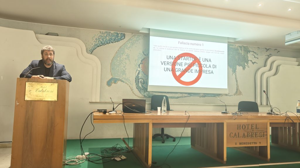 Il relatore e formatore di Fondazione Emblema, Roberto dal Bosco, nel corso della prima giornata del 16 aprile, ha illustrato consigli, definizioni “trappole”, rispetto a  molti concetti di grande importanza: dalla definizione di start up alla differenza tra business plan e business model, il business model Canvas, technology readiness level e investment readiness level,.