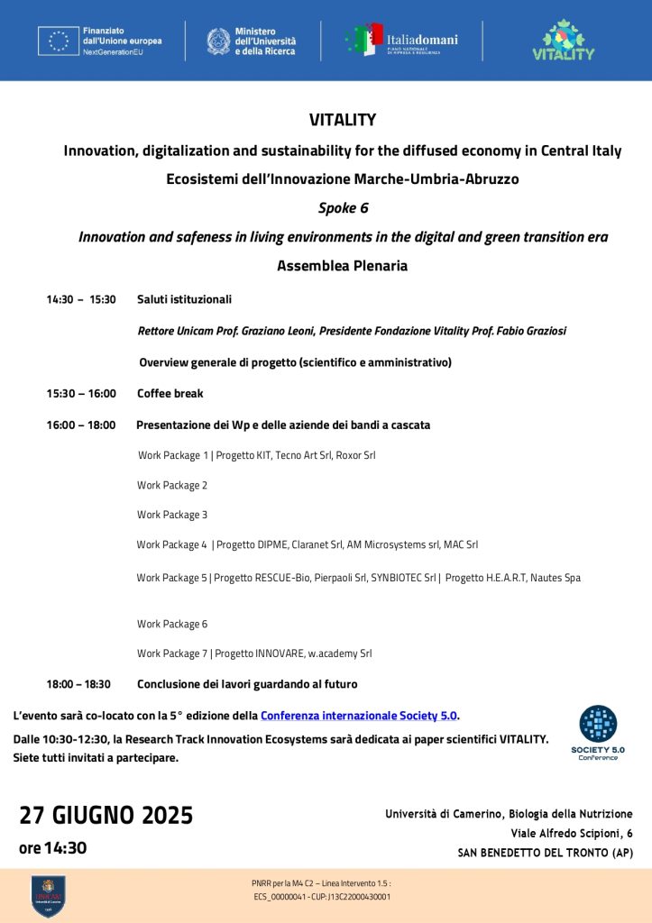 Si svolgerà presso il Polo di Università degli Studi di Camerino a San Benedetto del Tronto, dalle ore 14.30 del prossimo 27 giugno, l’assemblea plenaria dello Spoke 6 di Vitality.