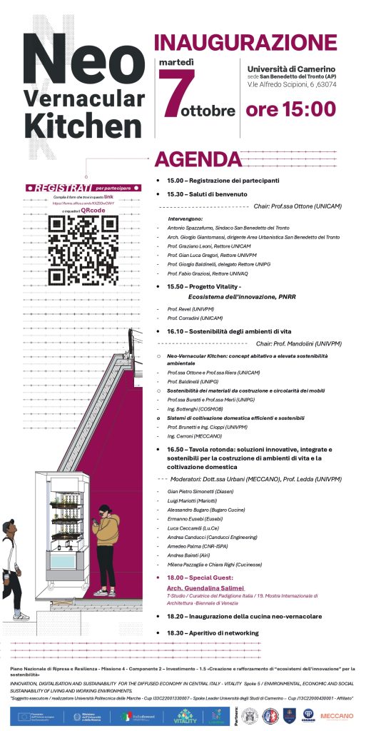 Si terrà il prossimo 7 ottobre presso la sede di Ateneo di San Benedetto del Tronto, l’inaugurazione di un manufatto affascinante realizzato nel progetto Vitality: un risultato concreto e tangibile di come la ricerca del progetto su innovative forme di benessere come capacità di ricucitura e rinascita dei territori del centro Italia colpiti dal sisma 2016-2017, possa anche richiamare l’attenzione sulla tradizione coniuguata con la tecnologia al servizio delle attuali sfide dei cambiamenti climatici: si tratta del progetto di cucina neovernacolare.