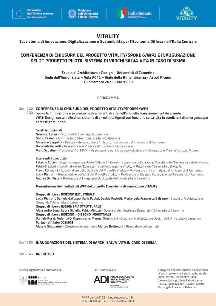 Si terrà il 16 Dicembre ad Ascoli Piceno presso la Scuola di Architettura e Design di Università di Camerino Sede dell’Annunziata, la conferenza di fine progetto del WP3 dello Spoke 6 Vitality. L’evento segnerà il momento conclusivo delle attività scientifiche di questo WP, nel quale verranno illustrati i risultati di ricerca conseguiti, e inaugurati i varchi salva vita in caso di sisma.